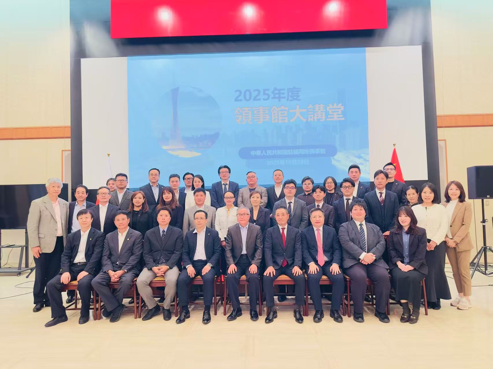 2025年10月28日,我会会长金洁敏率领包括本人在内的16余位会员,出席了由中华人民共和国驻福冈总领事馆主办的"2025年度总领馆大讲堂"活动。此次大会还邀请了福冈贸易协会的理事长平塚伸也及会员单位若干家。