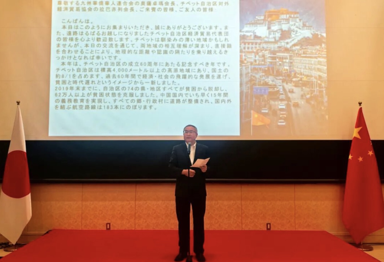 楊慶東总领事在致辞中介绍了西藏自治区成立60年来在经济社会发展、传统文化保护与传承、自然生态保护等方面取得的显著成就,并热情邀请日本朋友亲自前往西藏,亲身感受新时代西藏的美丽与发展。拉巴赤列会长表示,此次代表团通过参与“九州中国节”及本次交流会,不仅展示了西藏的新形象,也拓宽了合作空间,期待未来进一步深化西藏与九州地区在经贸、人文等多领域的交流与合作。
